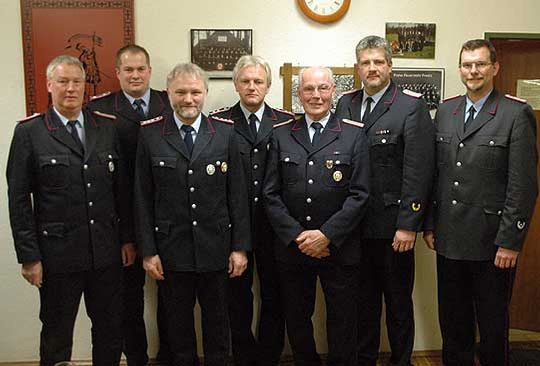 und Gemeindebrandmeister Torben Henning (links) mit den Geehrten und